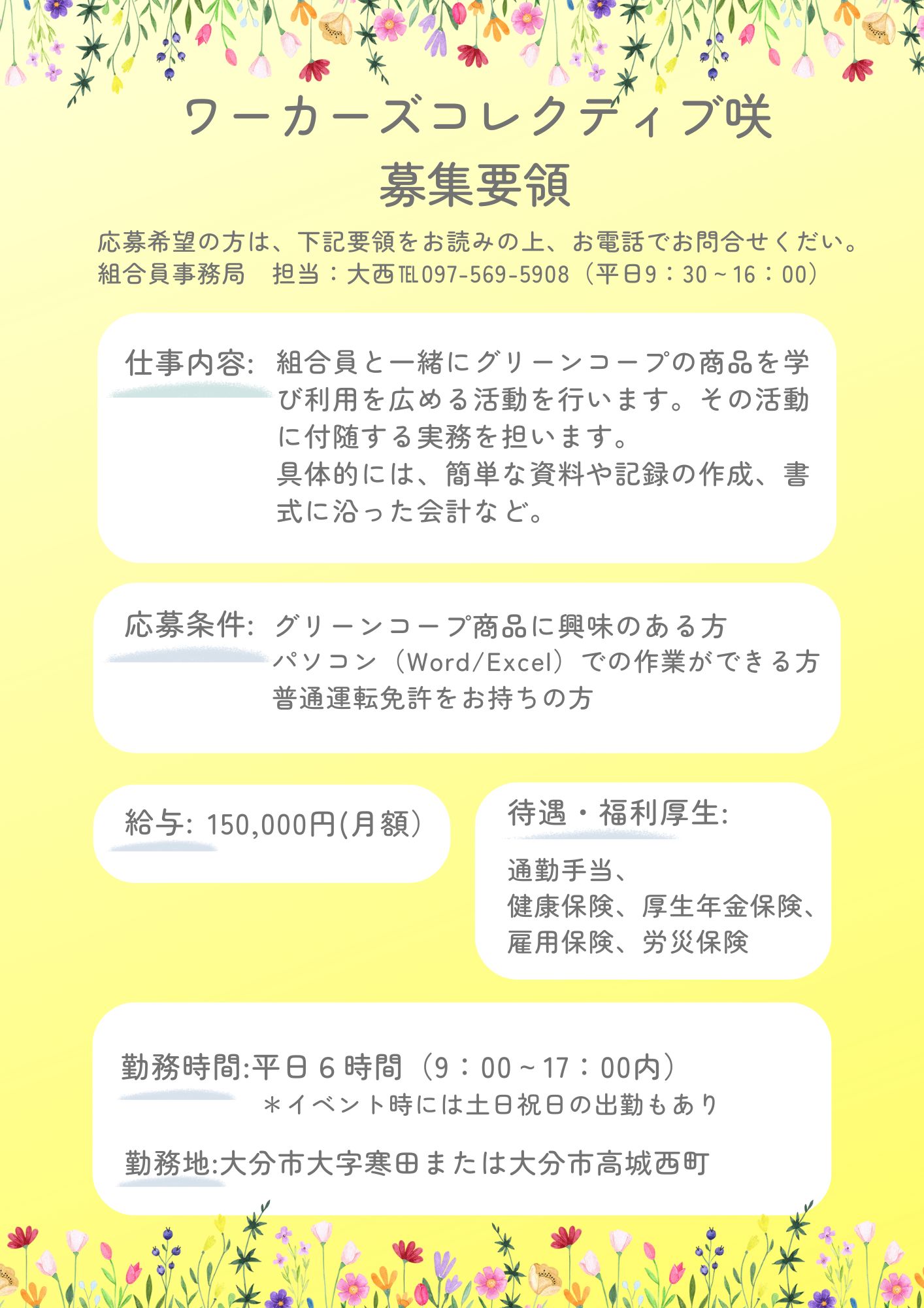 グリーンコープ生協おおいた ワーカーズコレクティブ咲では、組合員事務局員を若干名募集しています!