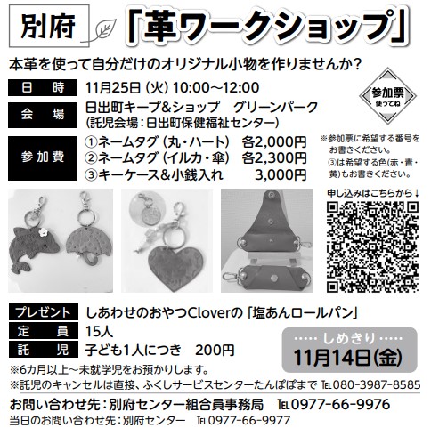 日にち:11月25日(火)10:00~12:00会場:日出町キープ&ショップ グリーンパーク 本革を使って自分だけのオリジナル小物を作りませんか? ●参加費●①ネームタグ(丸・ハート) 各2,000円②ネームタグ(イルカ・傘) 各2,300円③キーケーズ&小銭入れ 各3,000円 お問い合わせ・本人のキャンセル:別府センター組合員事務局TEL:0977-66-9976当日の連絡先:別府センターTEL:0977-66-9977 この記事を共有する